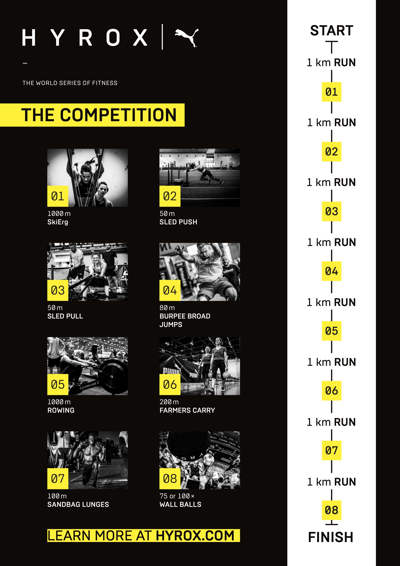 L’épreuve fusionne la course à pied avec des ateliers d’entraînement fonctionnels et composé de huit cycles, chaque cycle débutant par un kilomètre de course, suivi d’un exercice fonctionnel spécifique.